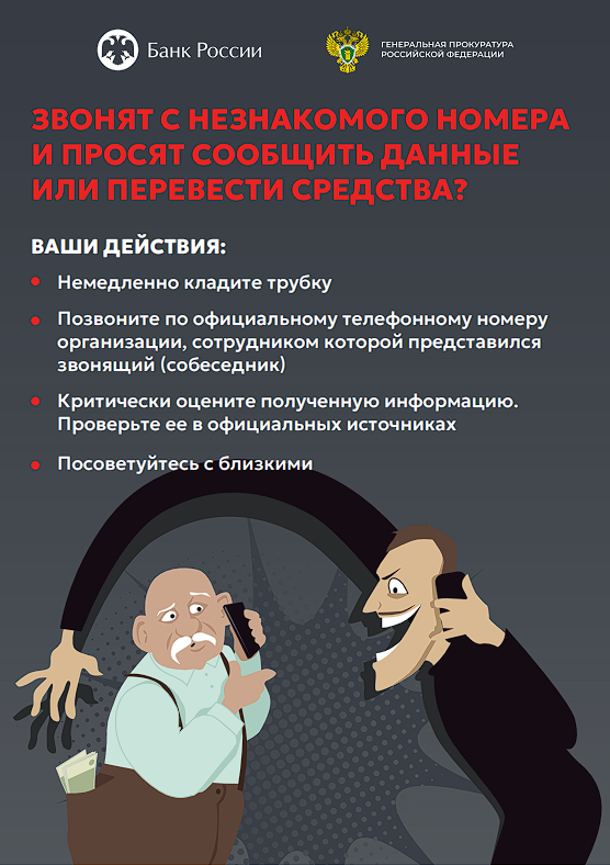 Предлагаем вам изучить цифровые плакаты, разработаные Генеральной прокуратурой Российской Федерации совместно с Банком России в целях повышения уровня информированности о действиях лиц, вводящих в заблуждение с целью хищения денежных средств, по предупреждению преступлений с использованием телекоммуникационных сетей.